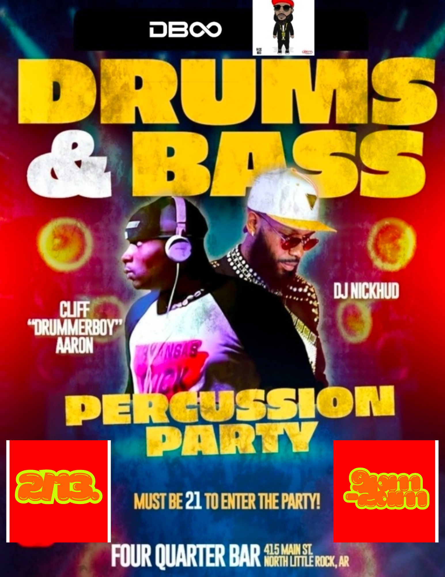 $10Drums and Bass ft. Dj Nick Hud and Cliff DrummerBoy Aaron is shakin’ up Four Quarter Bar this May (Must be 21 or Older to Enter the Party)