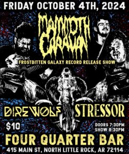 FRIDAY OCTOBER 4TH, 2024 MAMMOTH CARAVAN "FROSTBITTEN GALAXY" RECORD RELEASE SHOW WITH DIREWOLF AND STRESSOR DOORS AT 7:30, SHOW AT 8:30 $10 AT THE DOOR TIP YOUR BARTENDER