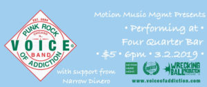 Voice Of Addiction from Chicago, IL will be playing an early show at Four Quarter Bar with local support from Narrow Dinero. Voice Of Addiction are politically charged and socially conscious Chicago based punk-rockers. As independent artists in every aspect, these boys are a force to be reckoned with. Boasting an impressive array of seven…